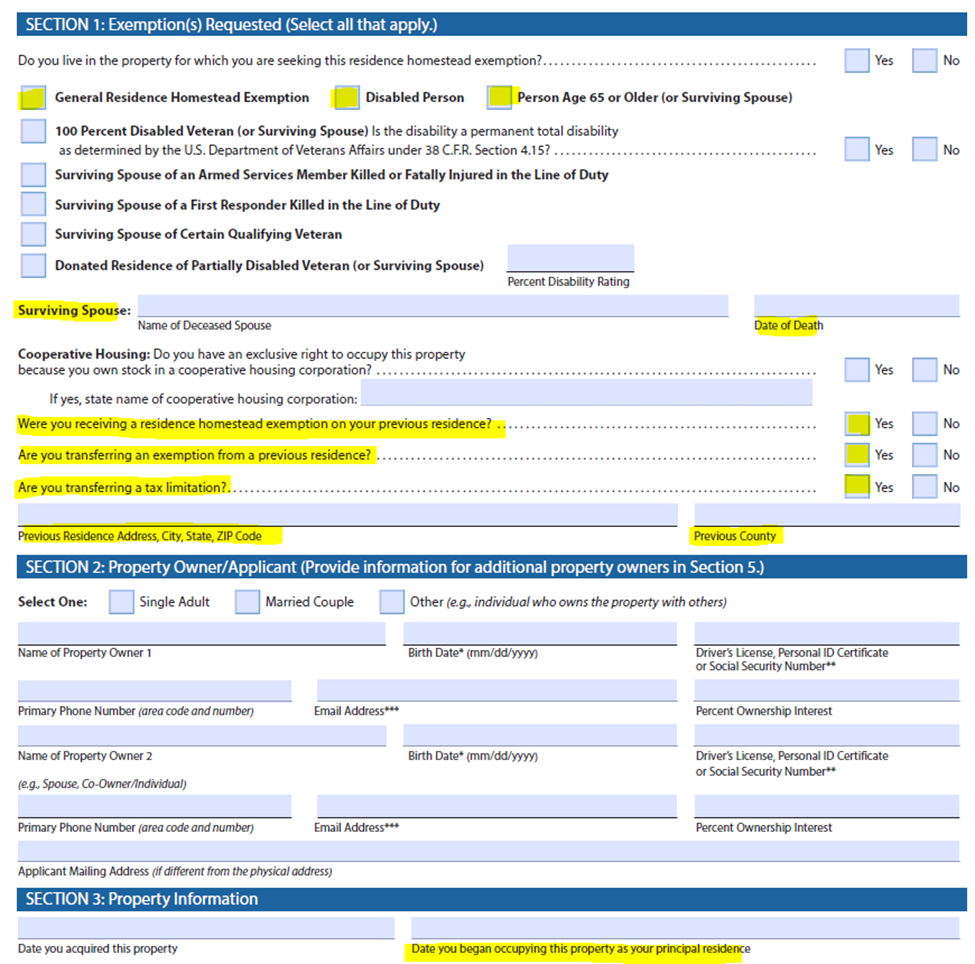 - Apply for a Residence Homestead Exemption and Over 65 (or Disabled Person) exemption on your new home (form 50-114).